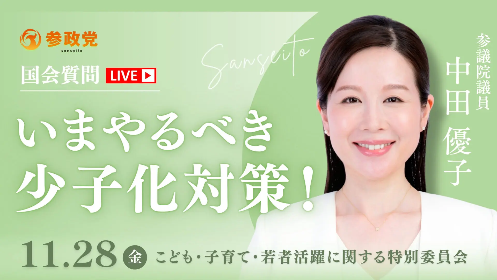 【国会質疑・こども・子育て・若者活躍に関する特別委員会】いまやるべき少子化対策!|参政党・中田優子(R7.11.28)