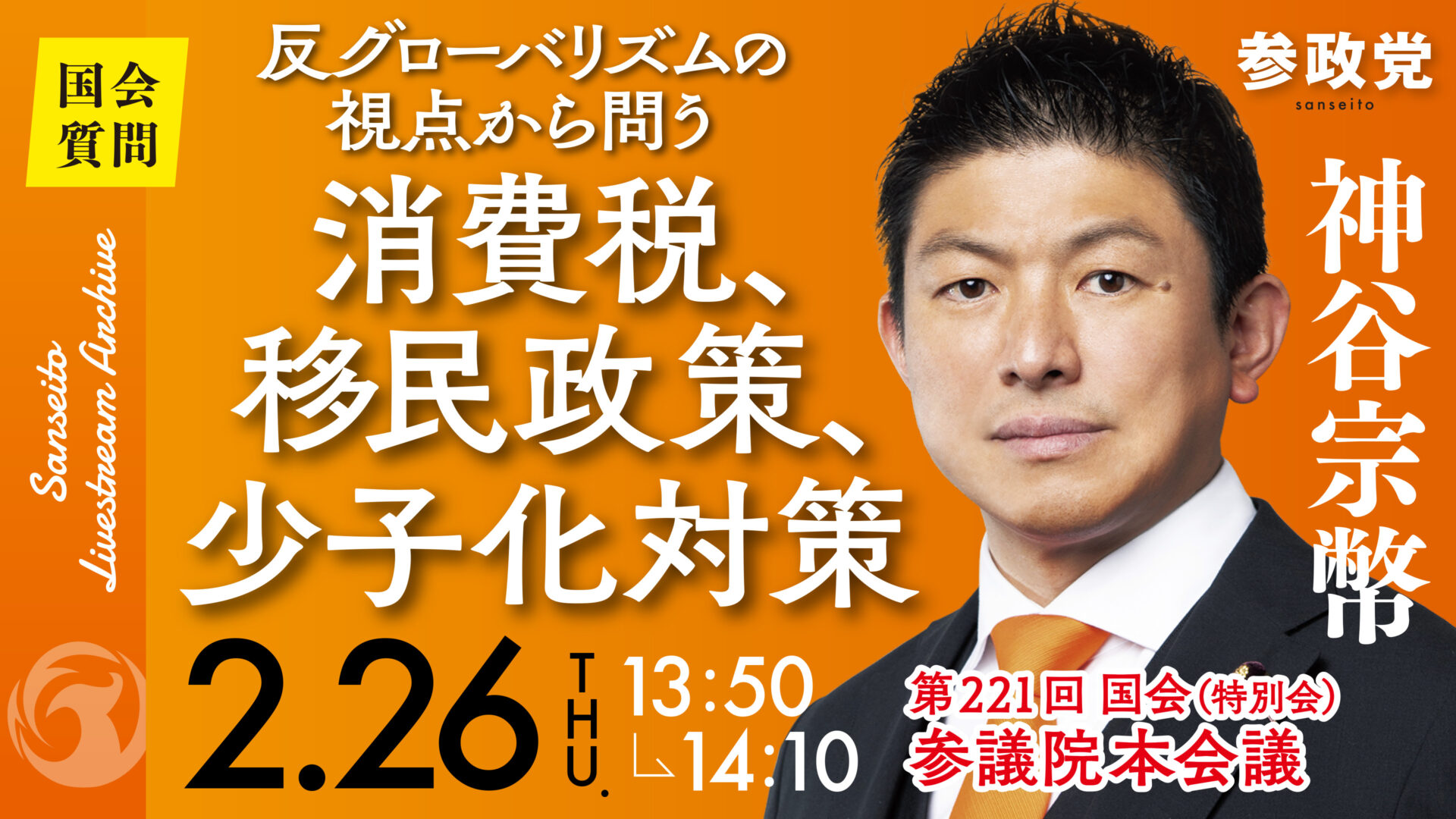 【本会議質疑】反グローバリズムの視点から問う 消費税、移民政策、少子化対策|神谷宗幣(R8.2.26)