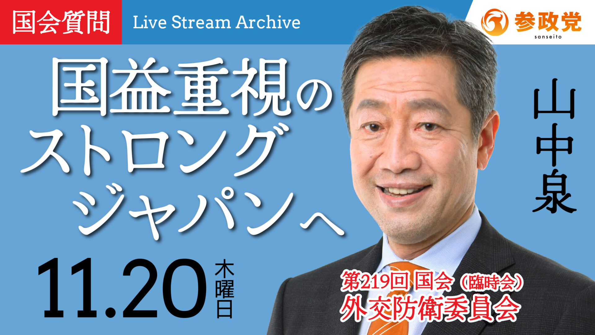 【国会質疑・外交防衛委員会】国益重視のストロングジャパンへ|参政党・山中泉(R7.11.20)