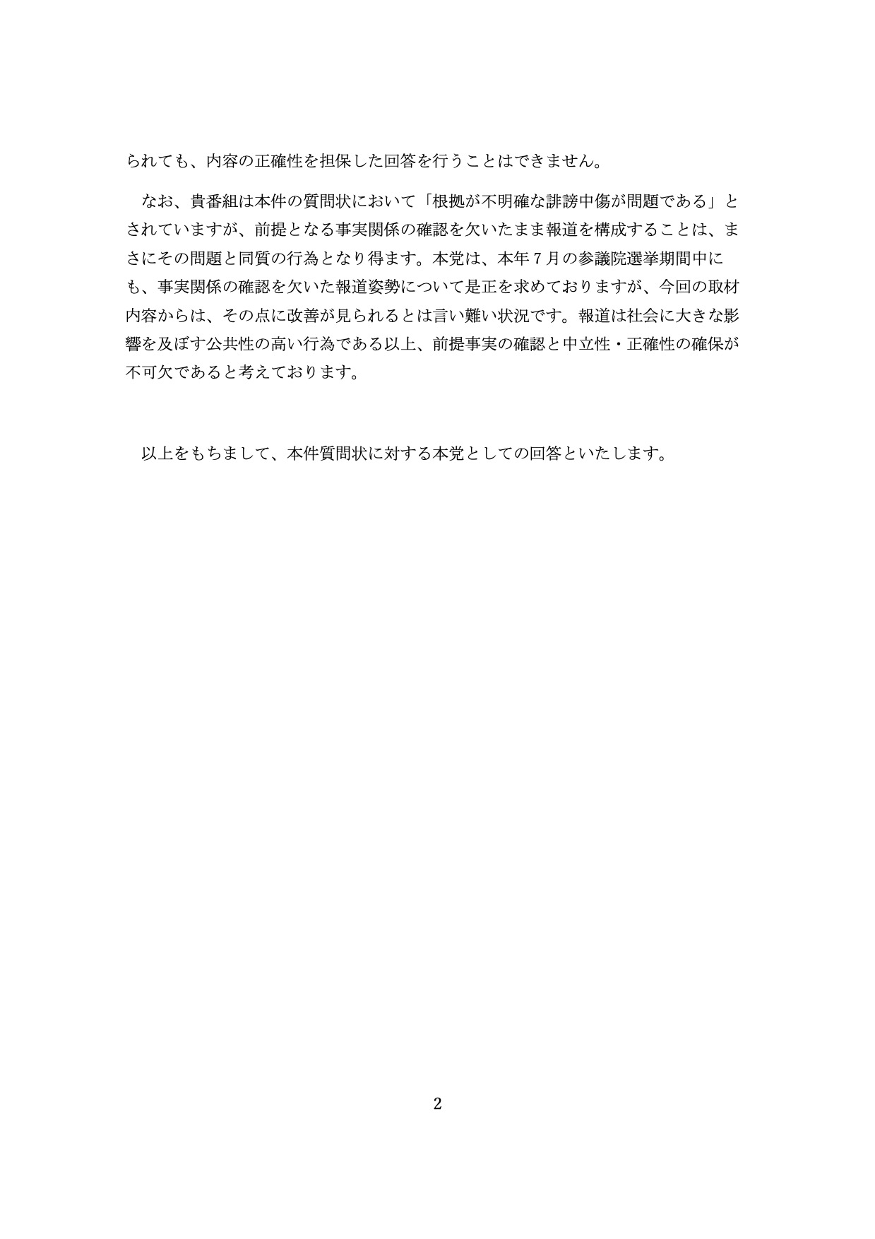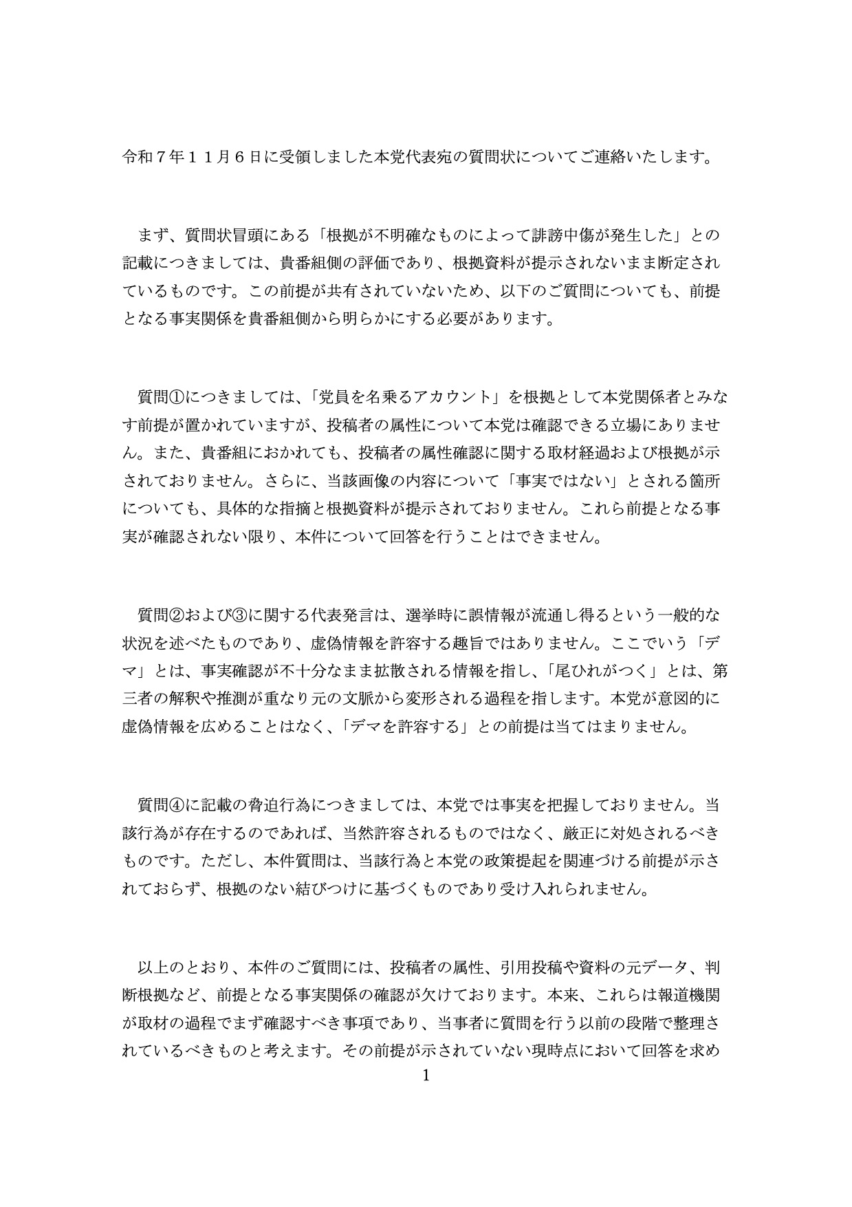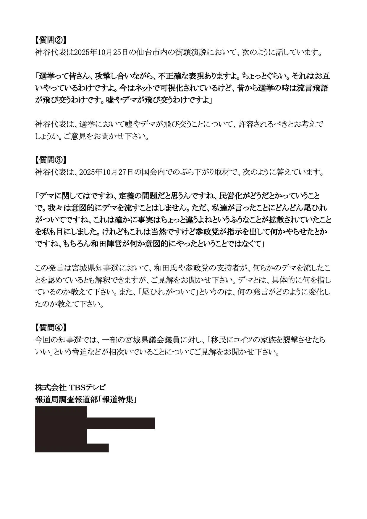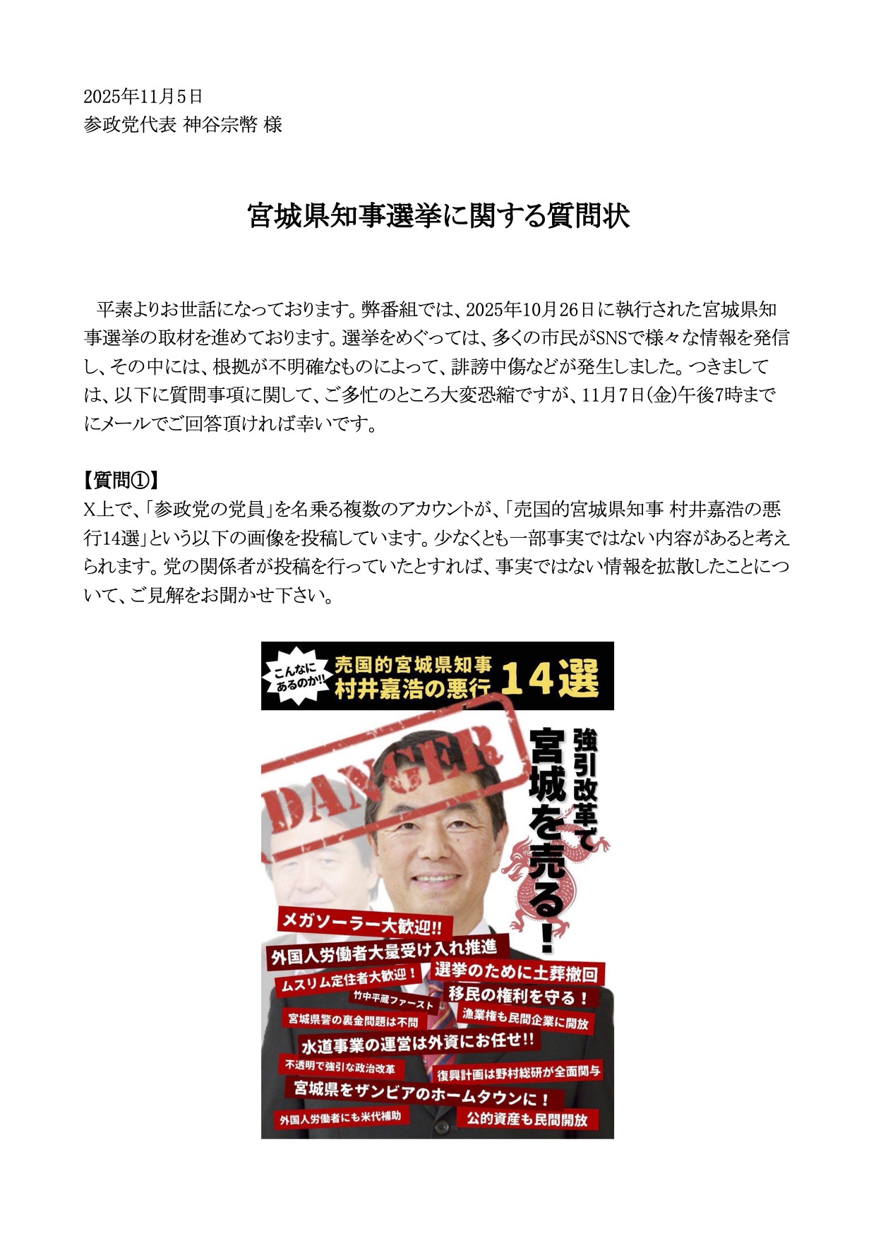 今般、本党に対し、株式会社TBSテレビ「報道特集」より、先の宮城県知事選挙に関する質問状が寄せられました。本党は、本年7月の参議院選挙期間中に同番組の報道内容に問題があると判断し、抗議を申し入れております。今回の質問内容につきましても、本党の立場を不正確に印象づける編集方針がうかがわれましたので、本日付で以下のとおり連絡しておりますことをお知らせいたします。以下に、本党から報道特集への通知文、報道特集からの質問文を掲載致します。