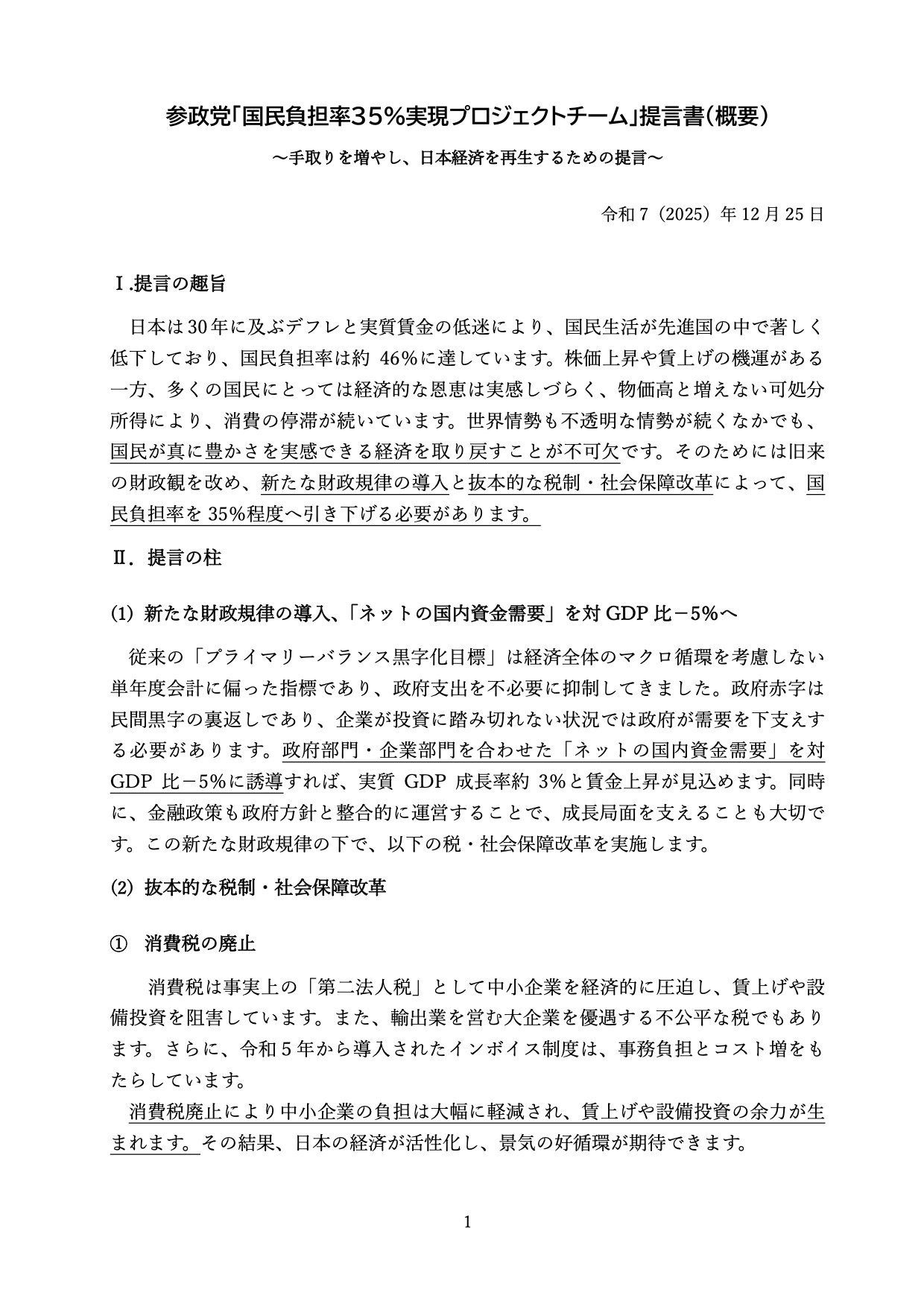 本日12月25日の臨時記者会見にて発表しました「国民負担率35%実現プロジェクトチーム提言書」の詳細をこちらに公開させていただきます。