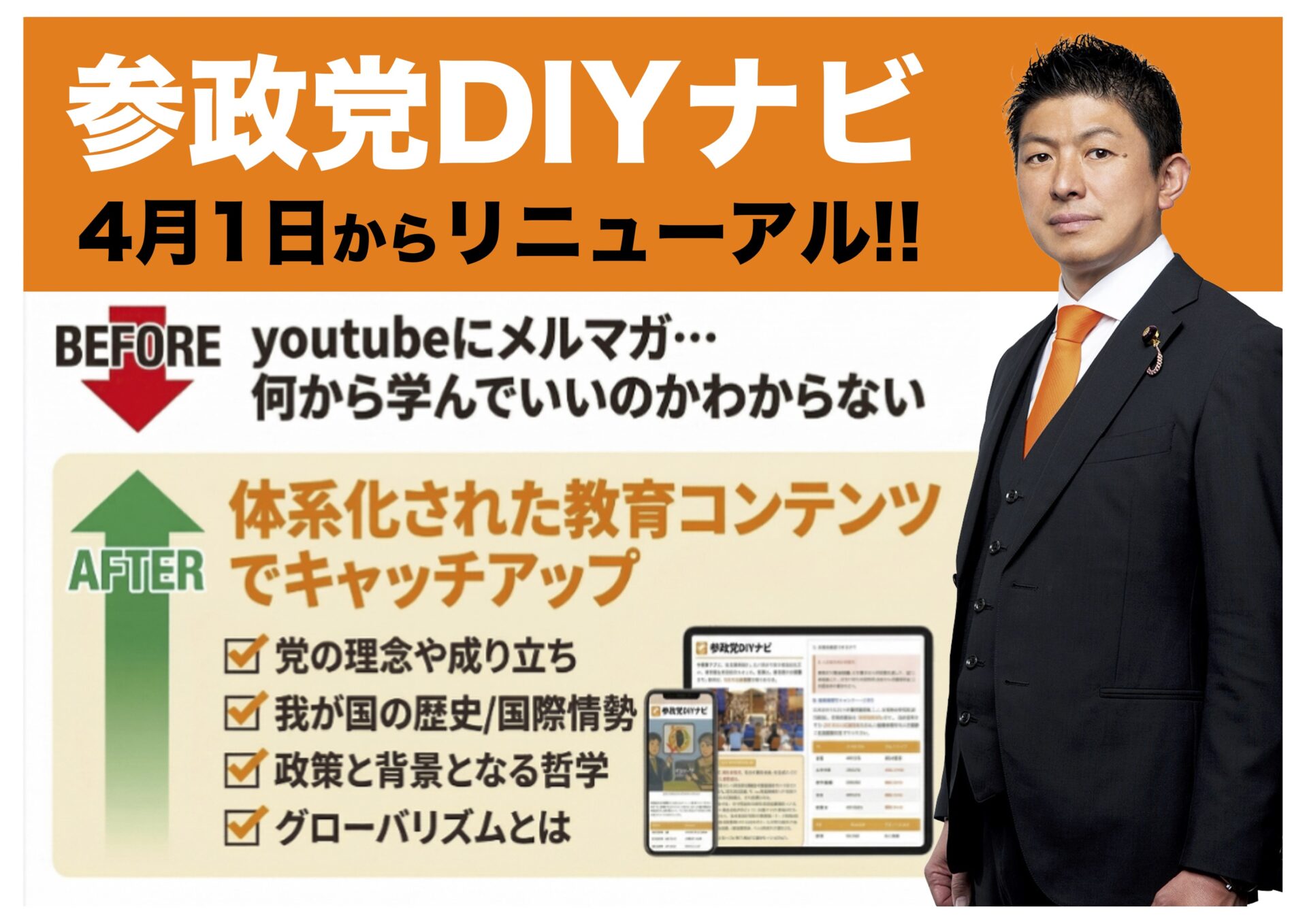 また、「学びの場が多すぎて分かりにくい」という要望に応え、4月1日より新アプリ「参政党DIYナビ」をスタートさせます。これまで分散していた党の理念や成り立ち、我が国の歴史や国政情勢、政策の背景となる哲学やグローバリズムとは何かといった基礎的な内容など全てをワンストップで体系的に学べる仕組みです。