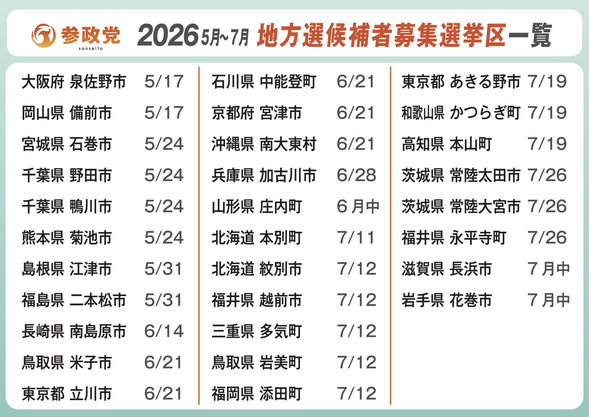 また、5月以降の選挙予定として候補者擁立を目指している地区を発表しました。党を挙げて応援すればほぼ当選が見込める選挙区となります。地方に根を張っていくというのが今年度の参政党の大きな目標です。ご応募をお待ちしています。