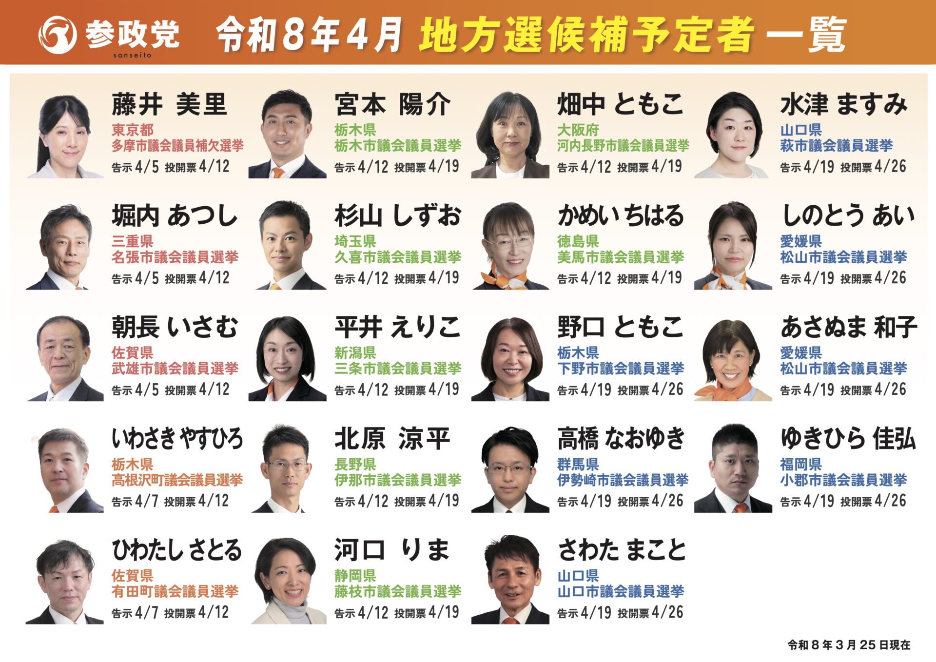 今後行われる地方選挙に向け、新たに12名の公認候補が発表されました。