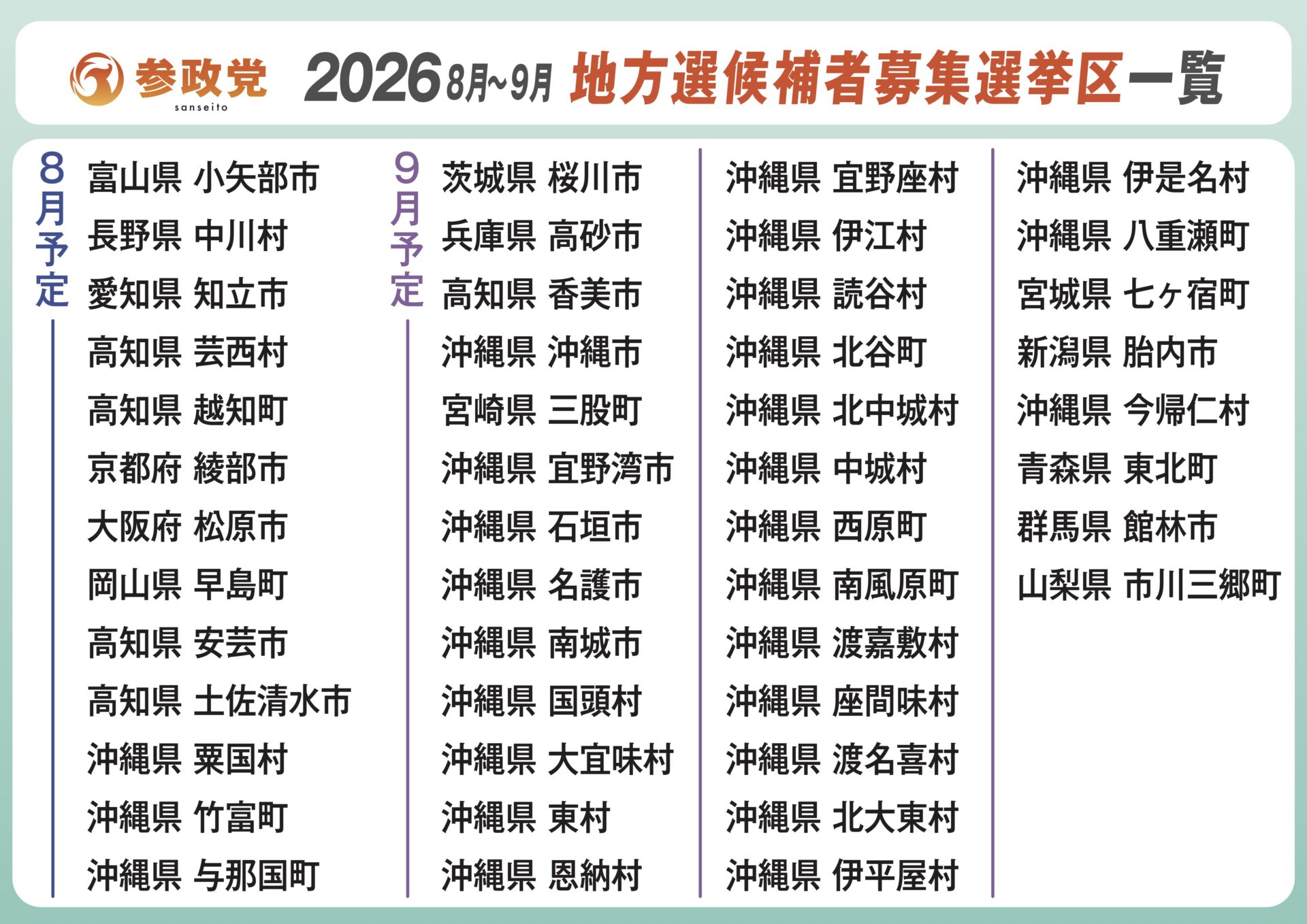 また、5月以降の選挙予定として候補者擁立を目指している地区を発表しました。党を挙げて応援すればほぼ当選が見込める選挙区となります。地方に根を張っていくというのが今年度の参政党の大きな目標です。ご応募をお待ちしています。